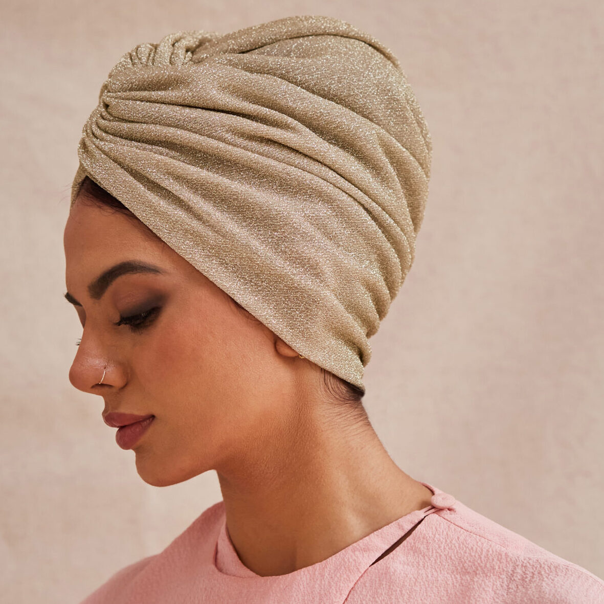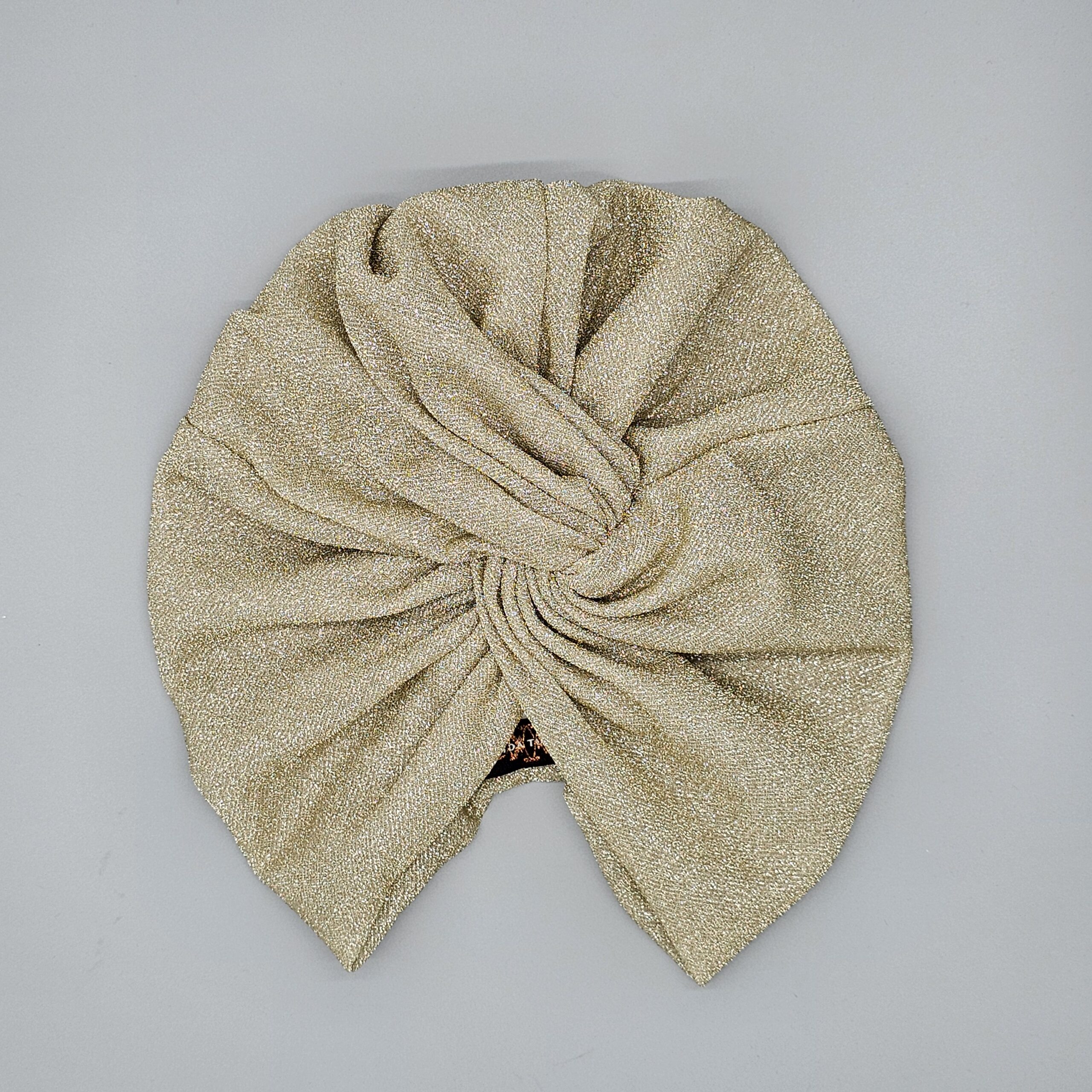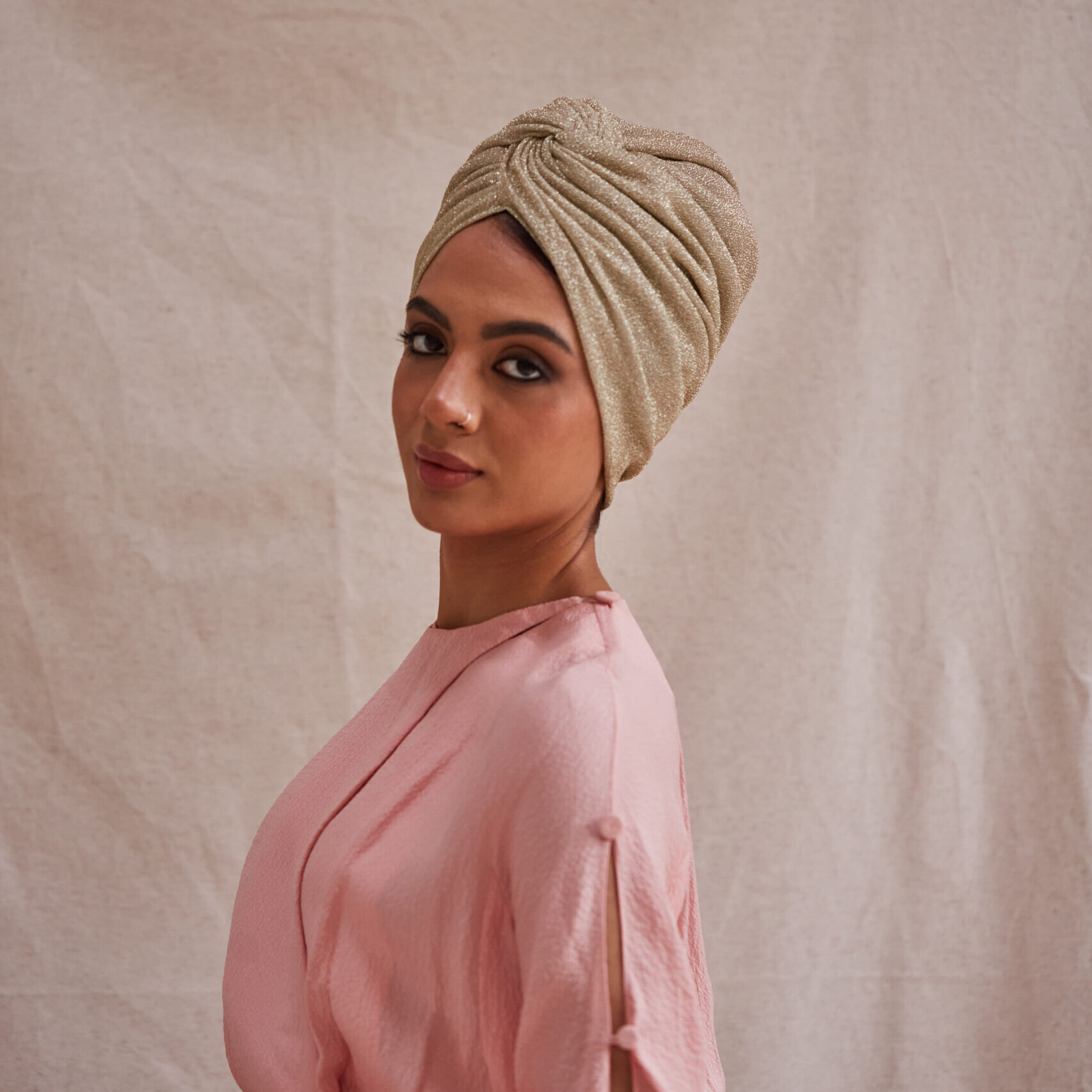 Our best-selling Maryam turban in lurex, named after one of our favourite clients. A lightweight and elegant turban which creates volume with its double twist front and gathered back. The natural stretch of high quality lurex offers maximum comfort and sizing flexibility.