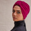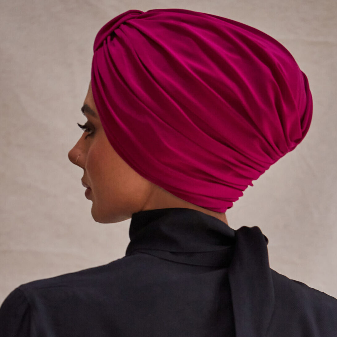 Our Naomi, based on a classic turban design in our luxuriant soft stretch jersey. A sleek and simple style with a front loop detail cut in our signature way with generous fabric to ensure your hair is properly covered. If you like our Leila, you might like wearing Naomi too.