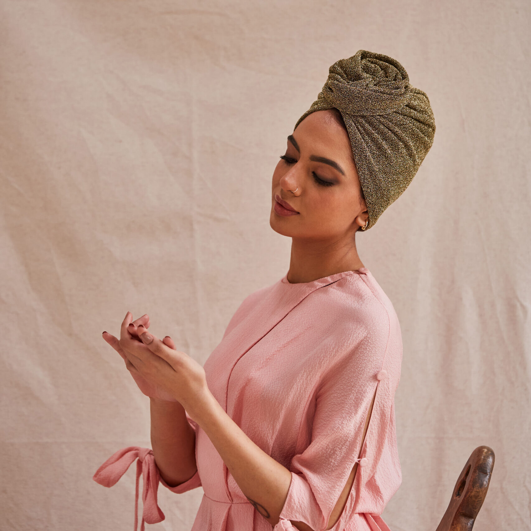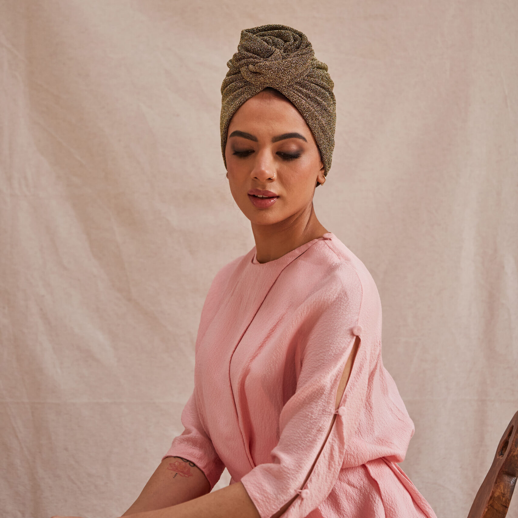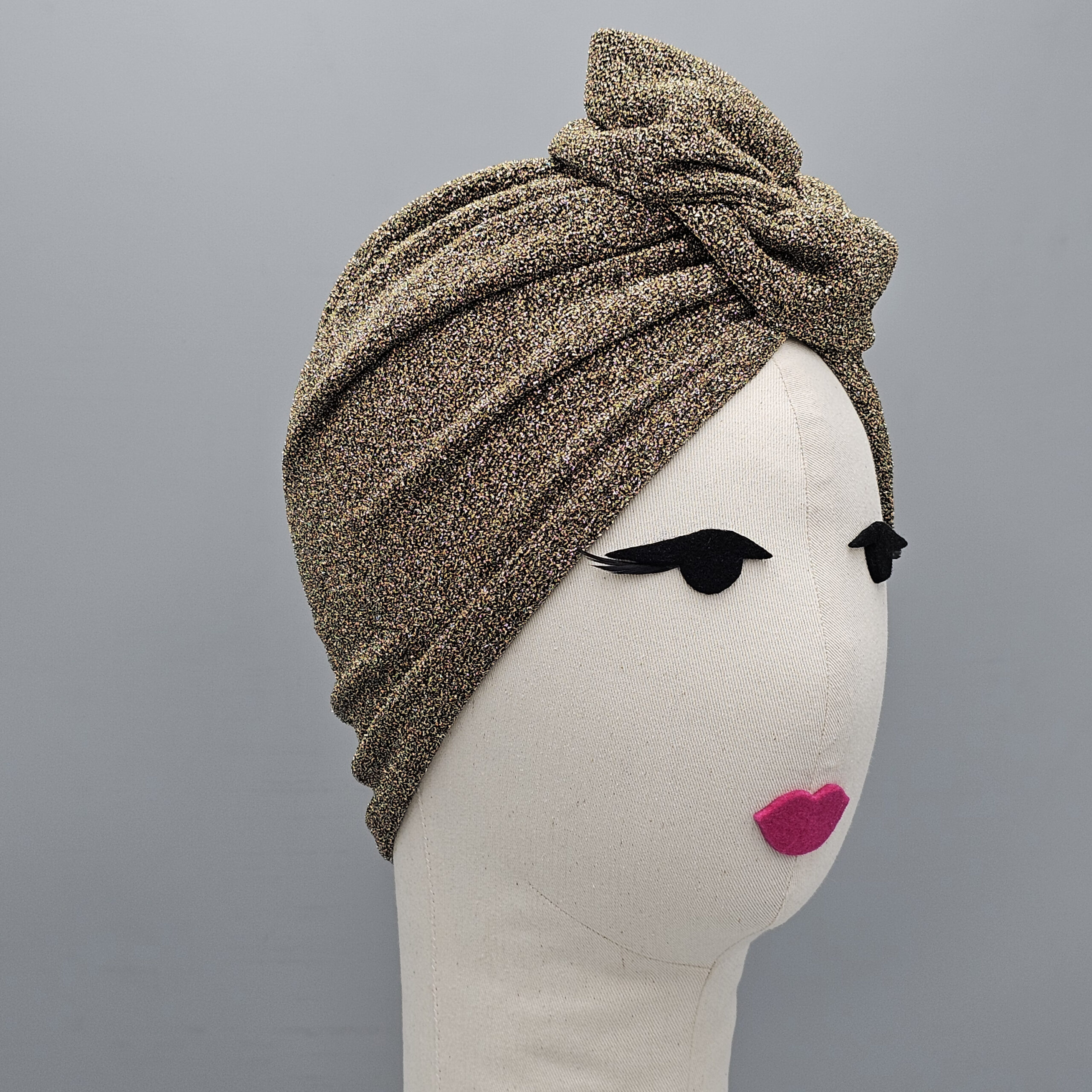 Our much-loved Rose turban in stylish lightweight lurex. A longstanding favourite with press and customers alike, Rose can be worn with the detailing in the front or to the side. The Rose creates height and elegance while the natural stretch of the fabric offers maximum comfort and sizing flexibility.