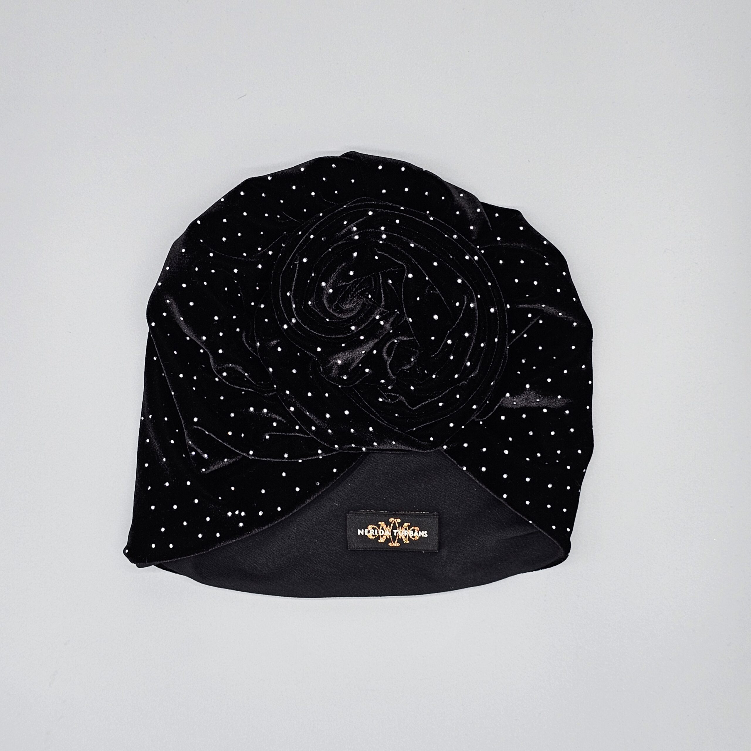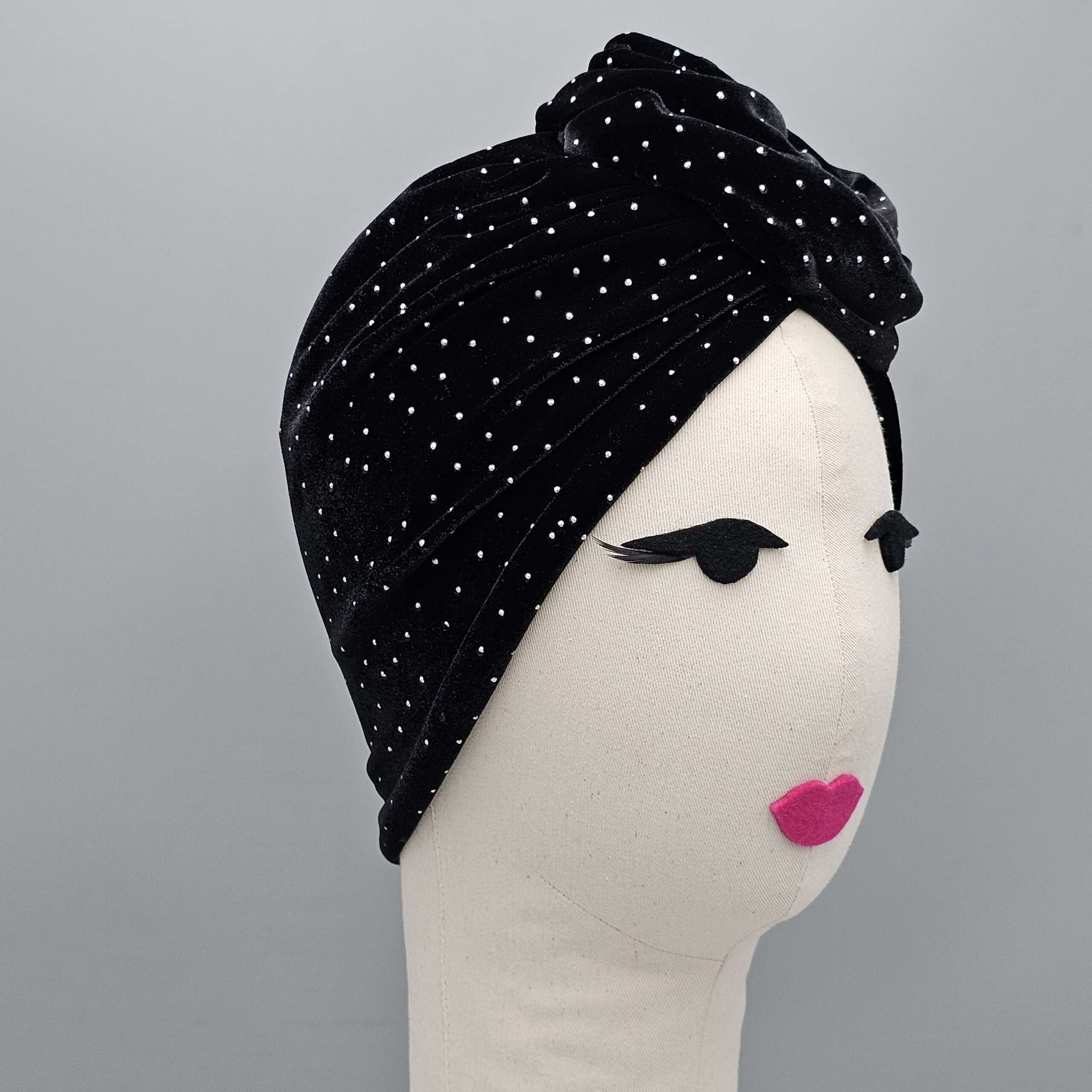 Our stunning Rose turban in velvet is fun and feminine and a longstanding favourite with press and customers alike. Designed to be worn with the detailing in the front or slightly to the side, the rose adds height and elegance to a warm and luxurious pre-tied headwrap.